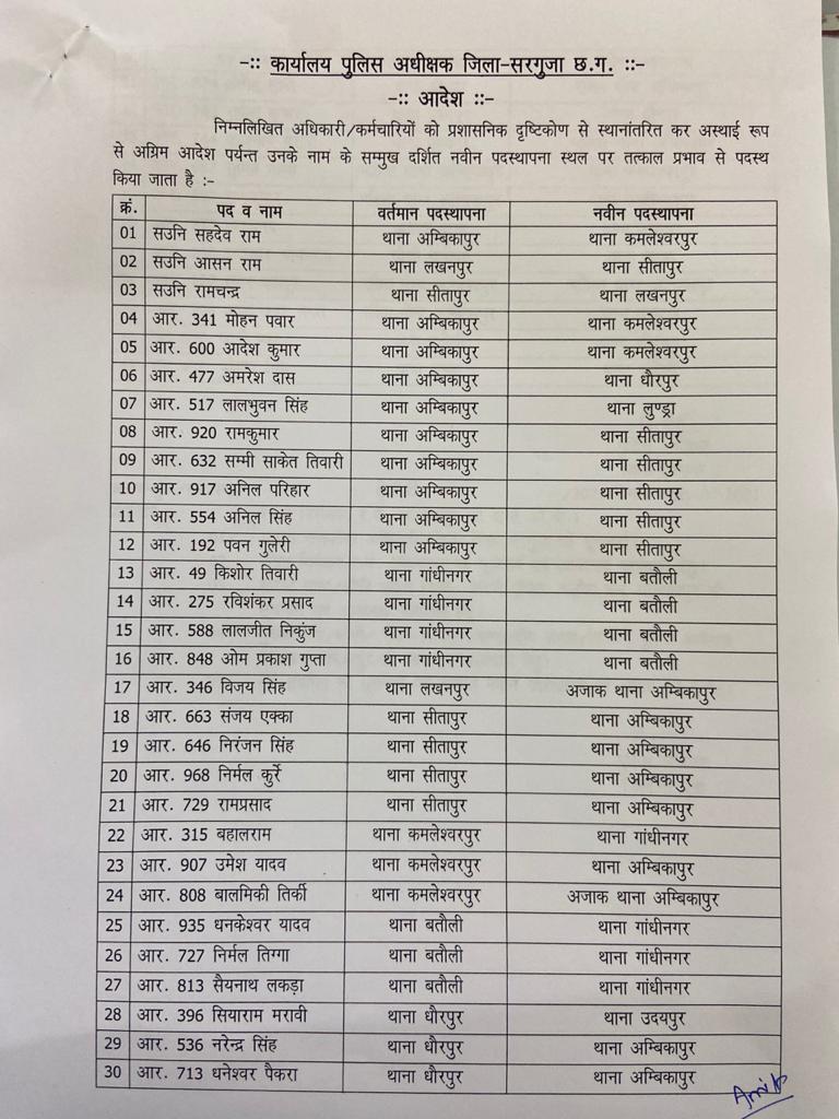 छत्तीसगढ़ः 3 ASI समेत 38 आरक्षकों का ट्रांसफर, शहरी थानों में जमे पुलिसकर्मी को भेजे गए ग्रामीण थानों में… देखिए पूरी लिस्ट
